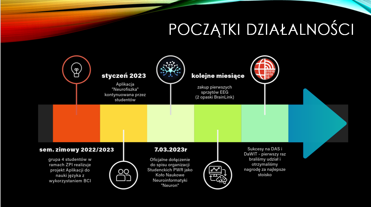 Jesteśmy nowo założonym kołem naukowym na Politechnice Wrocławskiej. Pomysł na koło pojawił się przy pracy nad wspólnym projektem – aplikacją do nauki języków z wykorzystaniem interfejsu mózg-komputer, czyli urządzenia EEG, które służy do badania aktywności mózgu.