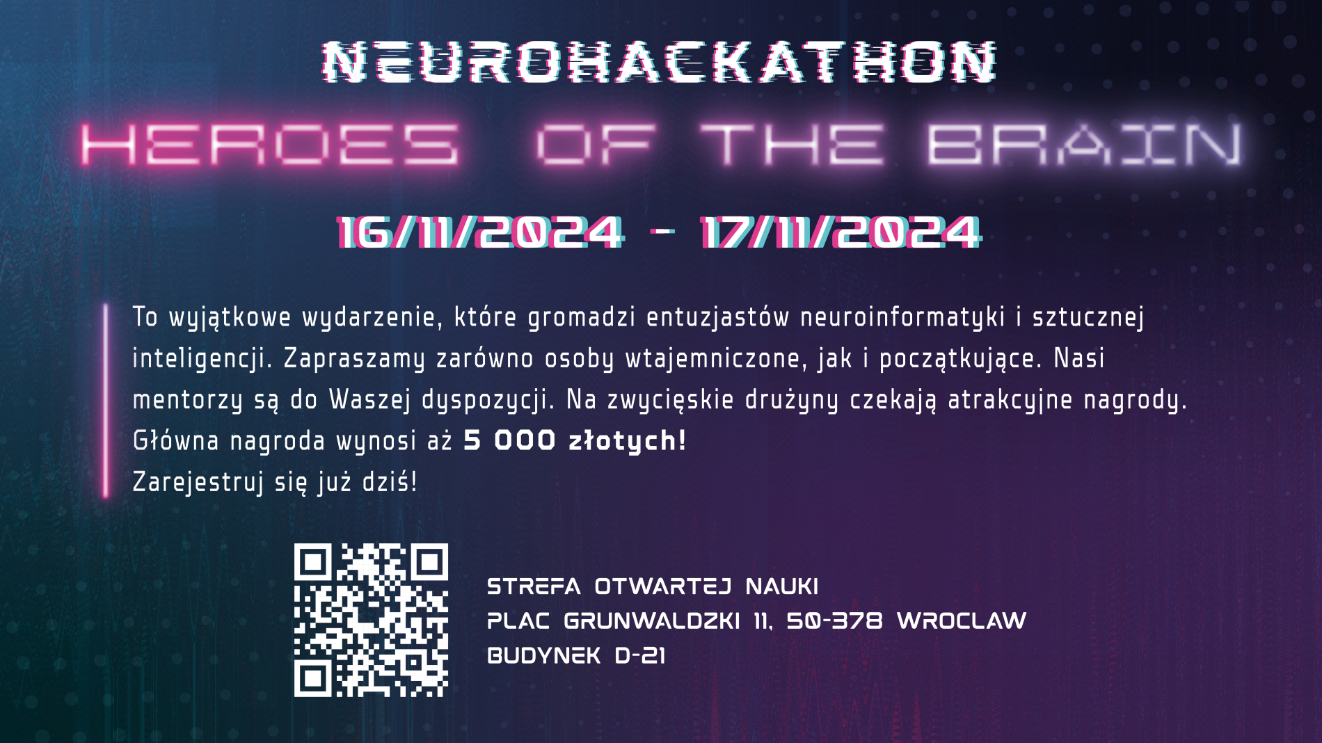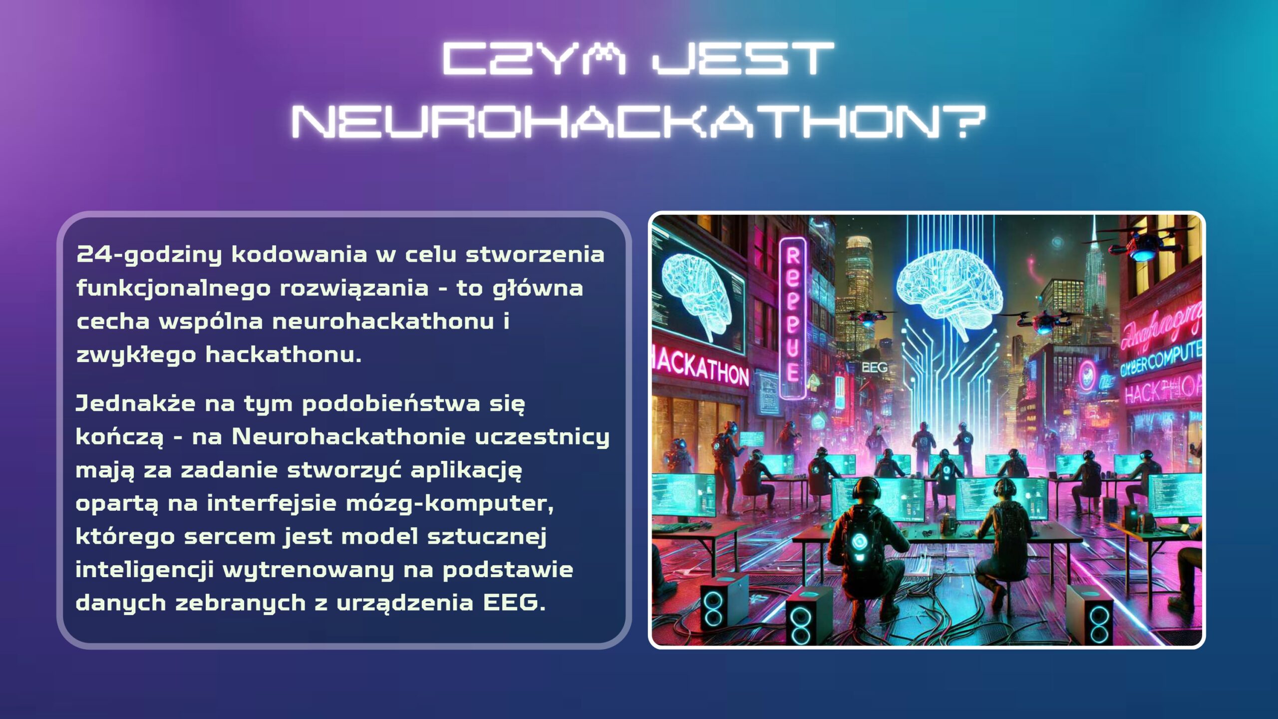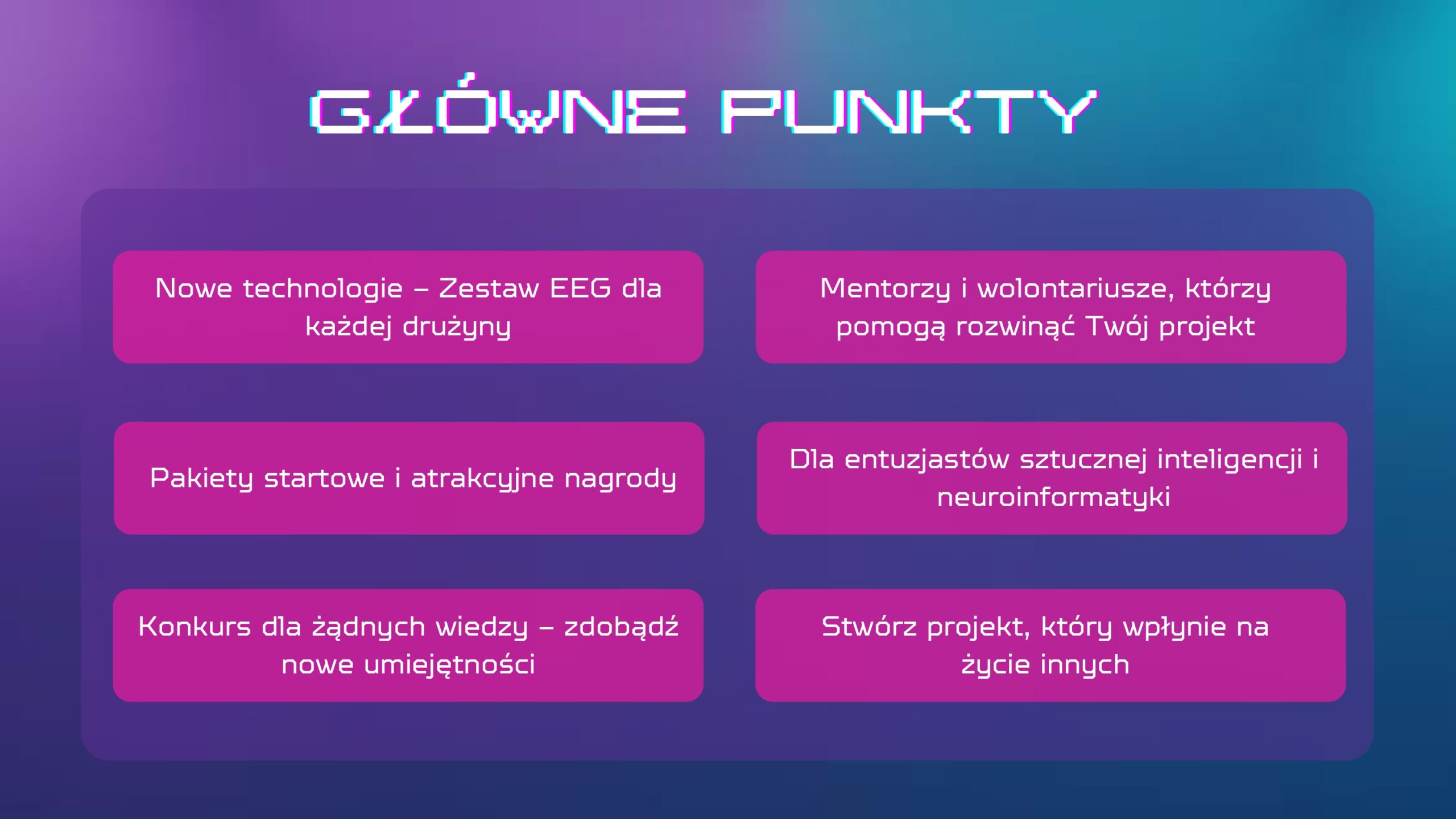 Zapraszamy wszystkich pasjonatów IT i AI, którzy chcą spróbować swoich sił z nowymi technologiami, takimi jak EEG. Łączna pula nagród wynosi 16 tys. zł, a główna nagroda to 5 tys. zł. Podczas wydarzenia na uczestników będą czekać mentorzy i wolontariusze, którzy pomogą w obsłudze sprzętu oraz poszerzą Wasze kompetencje.